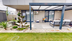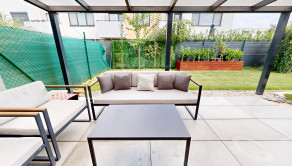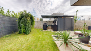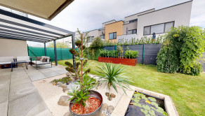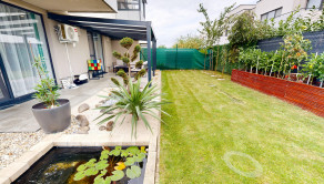 Neodmysliteľnou súčasťou bytu je aj záhrada, slniečko máte k dispozícii doobeda, pri vysokých teplotách isto oceníte popoludňajší tieň. Taktiež aj pri záhrade vidieť funkčnosť a cit majiteľov pre detail, jazierko, prestrešenie terasy, kvalitná dlažba, automatická závlaha, dva záhradné domčeky, letná kuchyňa či vyvýšené záhony, okrasné dreviny a ovocné stromy dodávajú bytu to čo pri iných bytoch postrádam. Byt je krajný čiže ďalšou výhodou je vstup na záhradu cez uzamykateľnú bránu, toto oceníte pri väčšom nákupe kde priamo z auta vyložíte nákup za bránu, alebo pri aktivitách kde bicykle, lyže, či pneumaticky nemusíte prenášať cez vchod a byt na záhradu.