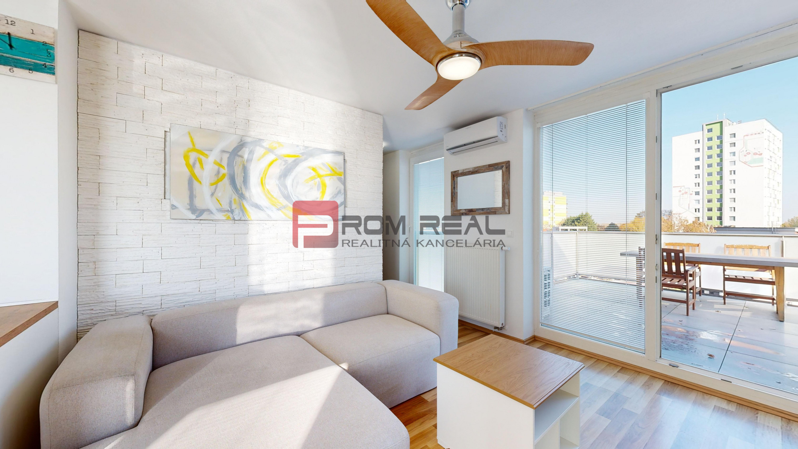 Rozloha bytu je 55m2+ terasa 15m2 + druhá terasa 15m2. Byt sa prenajíma kompletne zariadený a pôsobí veľmi útulnym dojmom. V byte je zavedený internet od Orange. V obývacej časťi je zavedená klimatizačná jednotka. Veľkou výhodou tohto bytu je že je slnečný a svetlý.