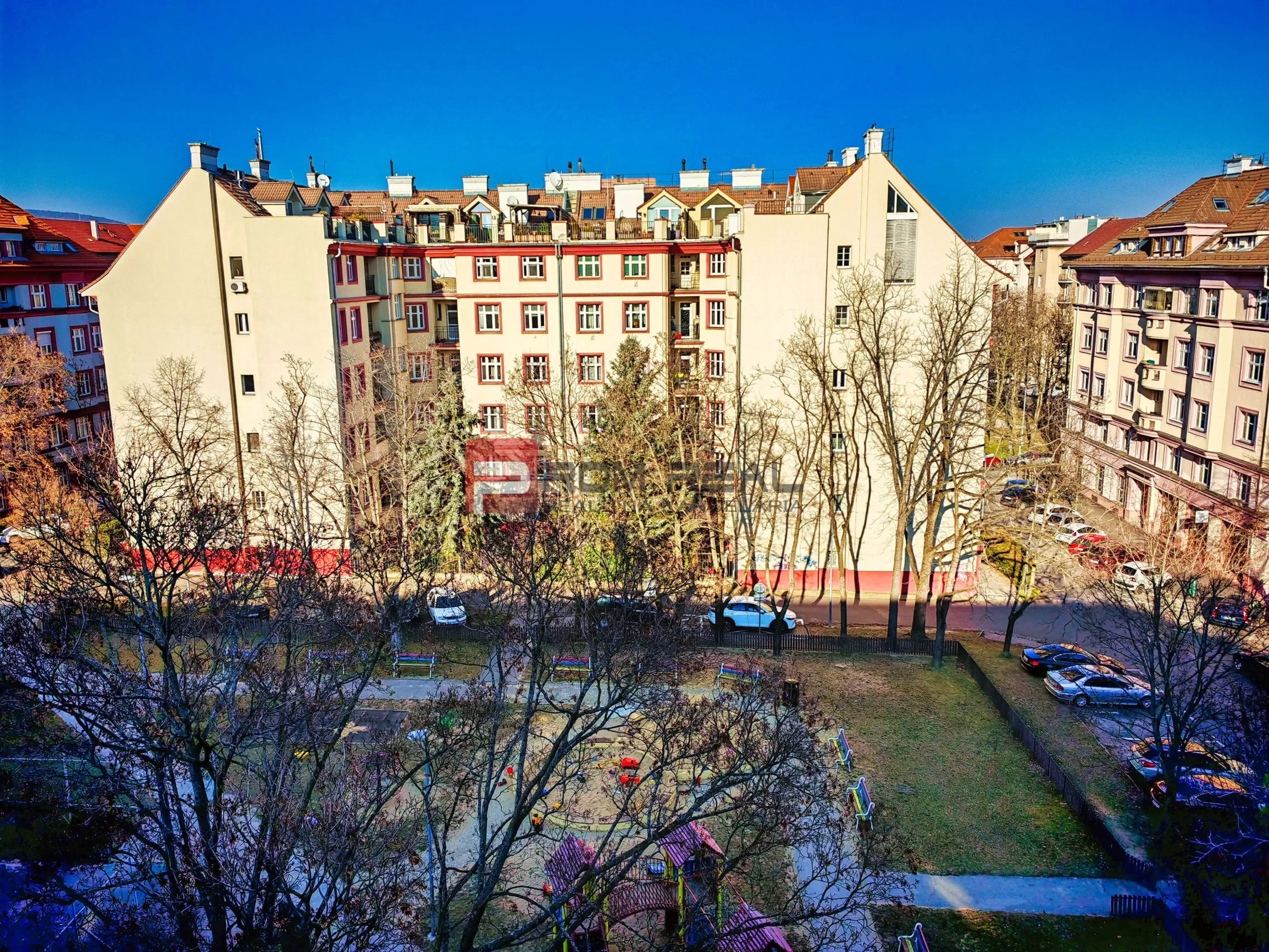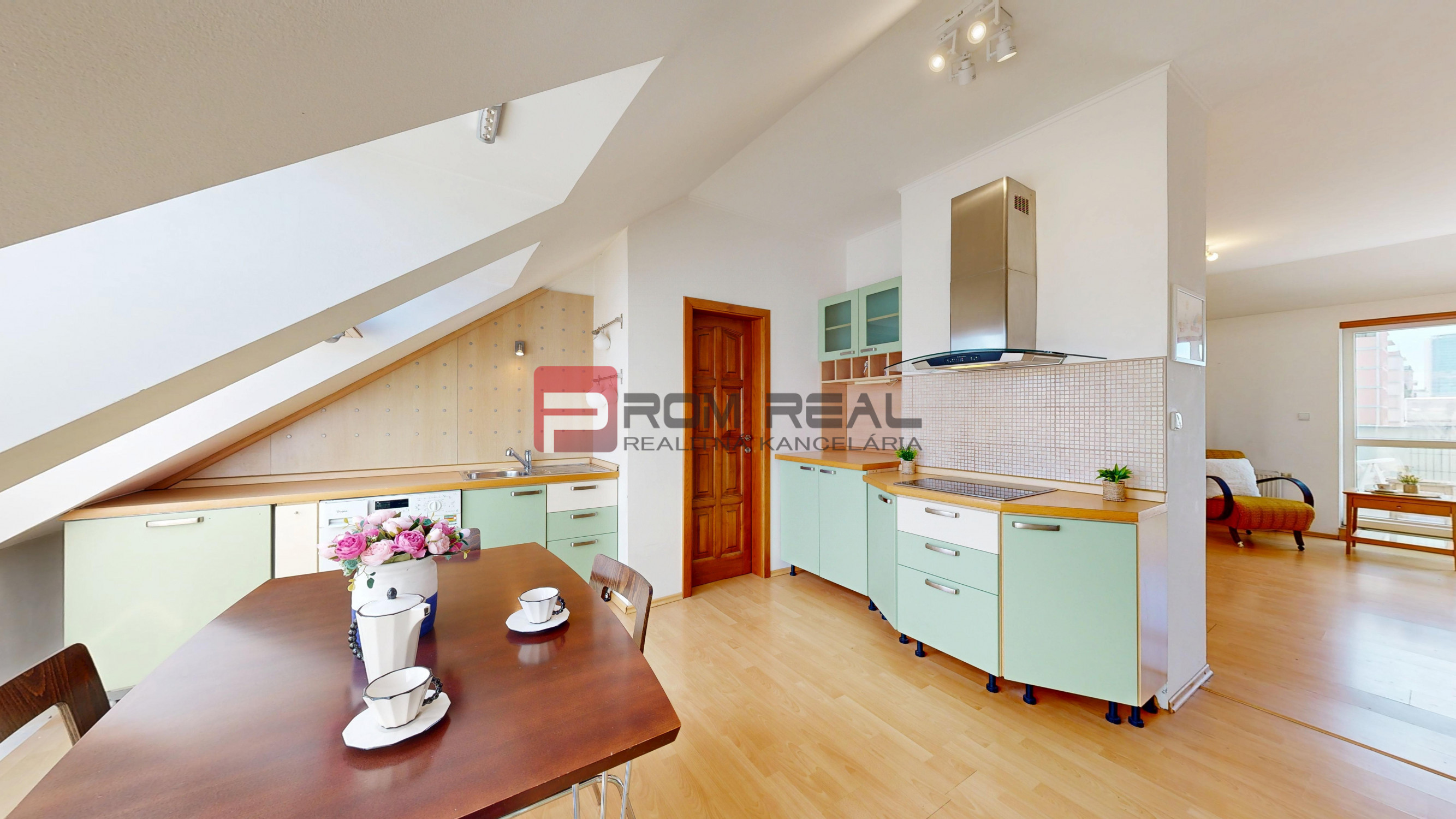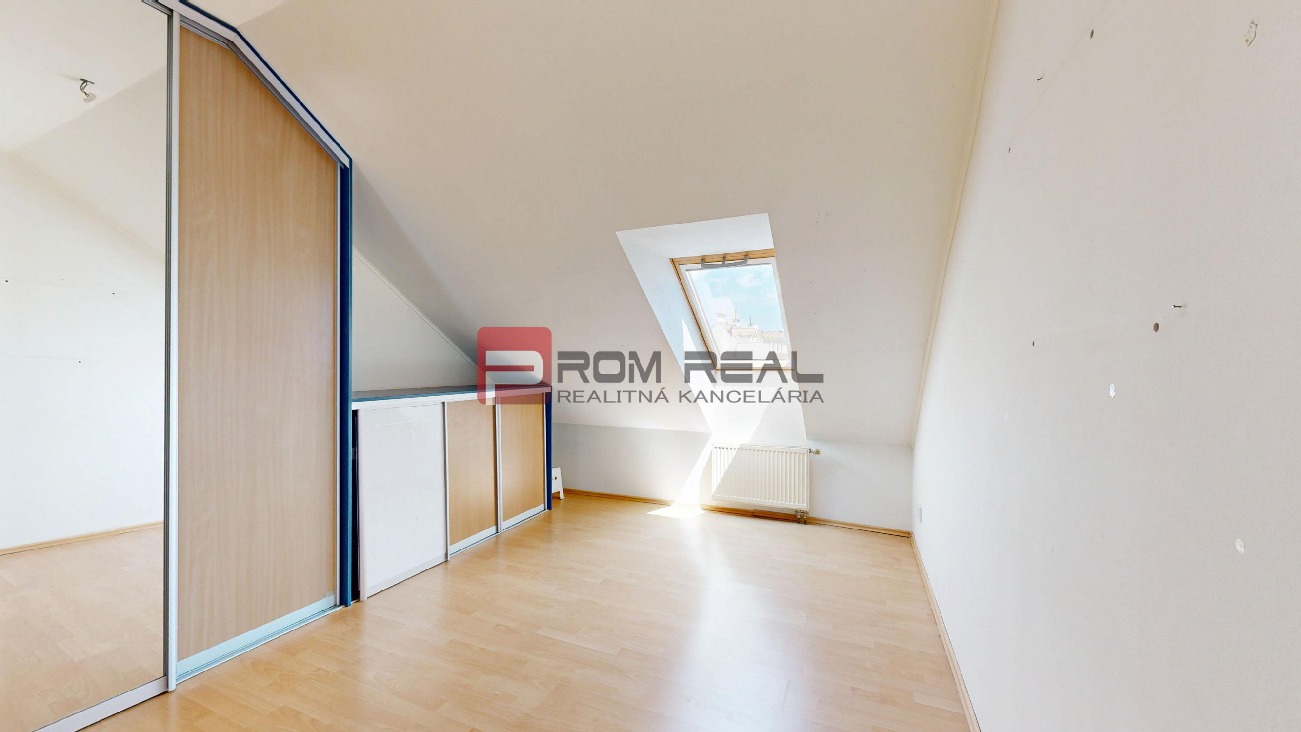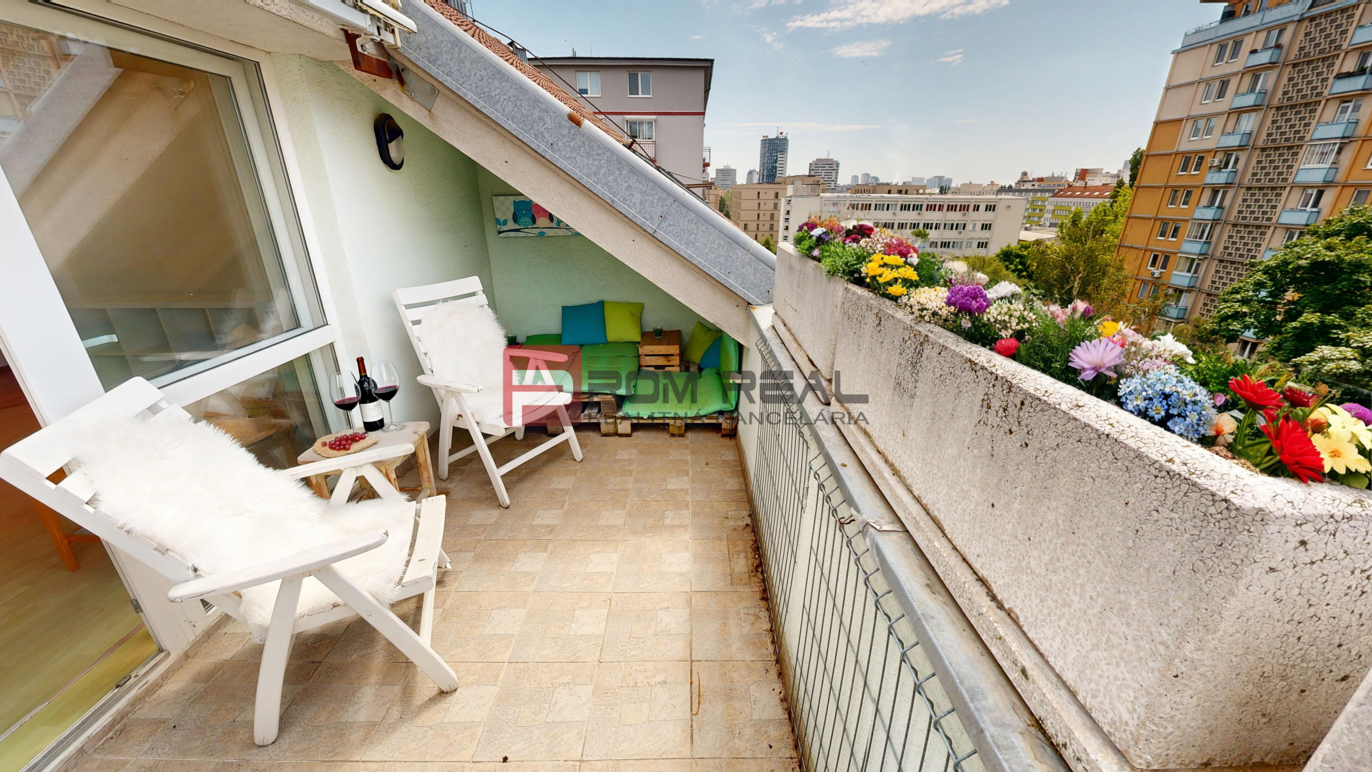 Podkrovný byt sa nachádza na 5. poschodí 5 poschodového tehlového bytového domu v nadstavbe z roku 1998. Poskytuje takmer 160m2 výbornej dispozície s dostatkom prirodzeného svetla. Pôvodný projekt rátal s piatimi izbami, no finálna realizácia zahŕňa len tri. Otvorením priestoru vznikla ohromujúca denná časť s vyše 64m2 otvoreného priestoru. Terasa vedúca z obývačky ponúka príjemný výhľad a ďalších takmer 14m2 maximálneho súkromia vhodného na príjemné večerné posedenia pri víne, či rodinné raňajky. V bytovom dome sa nenachádza výťah.