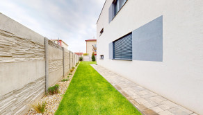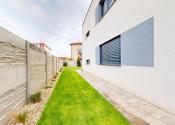 Záhrada je upravená kobercovým trávnikom, vysadenými stromami a rastlinami. O kosenie sa stará automatická elektrická kosačka, takže trávnik si žije vlastným životom a vy si môžete len vychutnávať rannú kávu na terase.