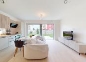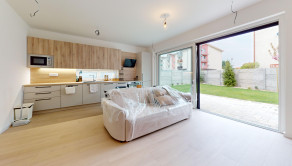 Dispozícia bytu pozostáva zo vstupnej chodby, detskej izby, spálne s výstupom do záhrady, obývacej izby spojenej s kuchyňou s priamym vstupom na terasu a do záhrady, kúpeľne so sprchovým kútom a dvoch samostatných WC.