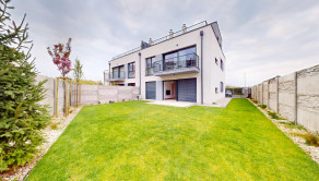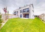 Záhrada je upravená kobercovým trávnikom, vysadenými stromami a rastlinami. O kosenie sa stará automatická elektrická kosačka, takže trávnik si žije vlastným životom a vy si môžete len vychutnávať rannú kávu na terase.