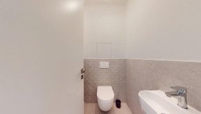 Dispozícia bytu pozostáva zo vstupnej chodby, detskej izby, spálne s výstupom do záhrady, obývacej izby spojenej s kuchyňou s priamym vstupom na terasu a do záhrady, kúpeľne so sprchovým kútom a dvoch samostatných WC.